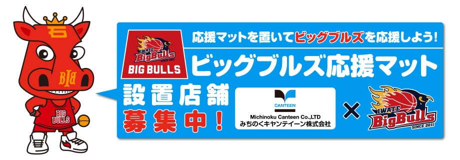 岩手ビッグブルズでは、みちのくキャンテイーン株式会社様と提携し、ブルズ応援マットの設置を展開しております。 マットリースの売上の一部が岩手ビッグブルズの活動資金となります。 皆様の応援マット設置のご支援、ご協力をお願い致します。