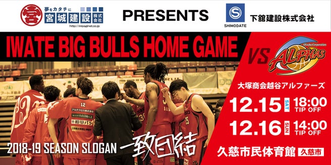 2018年12月15日(土)・16日(日)に久慈市民体育館で開催される「宮城建設株式会社・創業30周年記念下舘建設株式会社presents B3.LEAGUE 2018-19season レギュラーシーズン 岩手ビッグブルズ vs. 大塚商会越谷アルファーズ」より、新グッズを販売いたします。