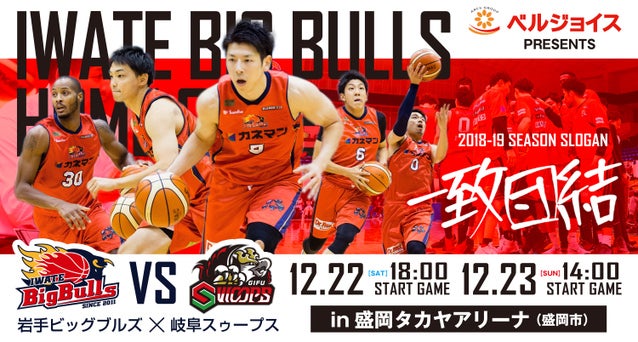 2018年12月22日(土)・23日(日)に盛岡タカヤアリーナで開催される「創業90周年記念 株式会社ベルジョイス Presents B3.LEAGUE 2018-19season レギュラーシーズン 岩手ビッグブルズ vs. 岐阜スゥープス」 のゲームスケジュールをお知らせいたします。
