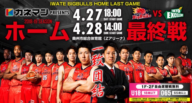 2019年4月27日(土)・28日(日)に奥州市総合体育館(Zアリーナ)で開催される「カネマンPresents B3.LEAGUE 2018-19season ファイナルステージ ホーム最終戦 岩手ビッグブルズvs.東京エクセレンス」のゲームスケジュールをお知らせいたします。