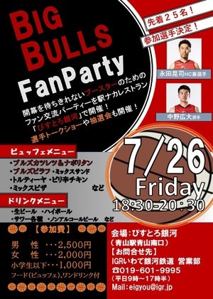 IGRいわて銀河鉄道青山駅青山南口にあります「びすとろ銀河」にて「BIG BULLS Fan Party in びすとろ銀河」が7月26日(金)に開催されます。