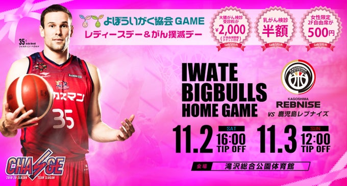 岩手ビッグブルズvs鹿児島レブナイズ戦の観戦チケットをお持ちの女性の方のみ受診することができます。