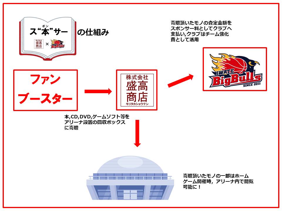 ご家庭の本棚や押し入れ,物置き,引き出しの奥などに眠っている本やゲームソフト,CD,DVDなどをホームゲーム会場内,盛高商店様のブースまでお持ちください。皆様にご提供していただいたものは,盛高商店様に査定していただき,盛高商店様を通じて全額を「ス“本”サー料」として、チーム強化費に充てさせていただきます。