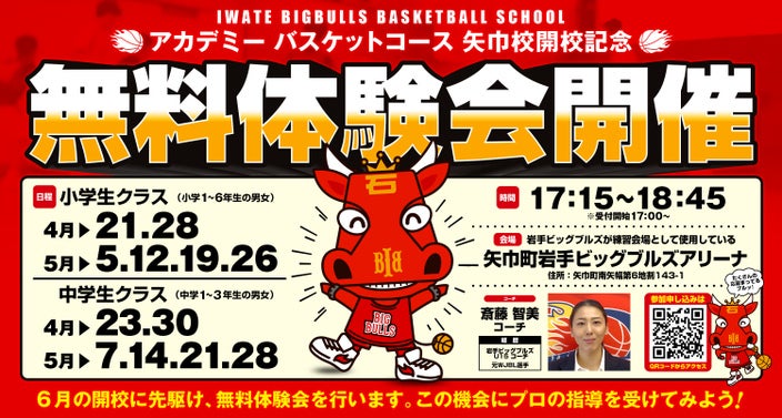 岩手ビッグブルズが運営をしている岩手ビッグブルズアカデミー バスケットコースでは、新たに矢巾校を開校いたします!岩手ビッグブルズの選手が練習会場として使用している”矢巾町岩手ビッグブルズアリーナ”を会場とし、岩手ビッグブルズU15のコーチを務める元WJBL選手の斎藤智美コーチが指導します。みんなで楽しくバスケットを学びましょう☆