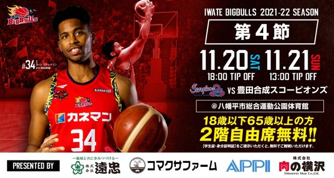 このたび岩手ビッグブルズでは、2021年11月20日(土)・21日(土)に開催される「B3.LEAGUE 2021-22season ホーム第4節 豊田合成スコーピオンズ戦」の冠パートナーが「株式会社遠忠」様・「有限会社コマクサファーム」様・「APPI」様・「株式会社肉の横沢」様に決定しました。