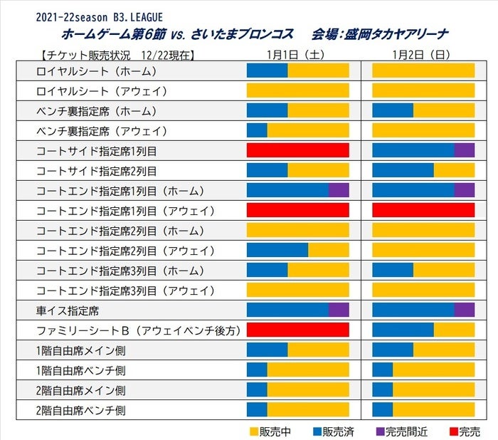 1月1日(土)、2日(日)に、盛岡タカヤアリーナにて開催いたします「竹下医院/みうら産婦人科医院 Presents B3.LEAGUE 2021-22 season 岩手ビッグブルズ vs. さいたまブロンコス」のチケット販売状況(12月22日時点)についてお知らせいたします。