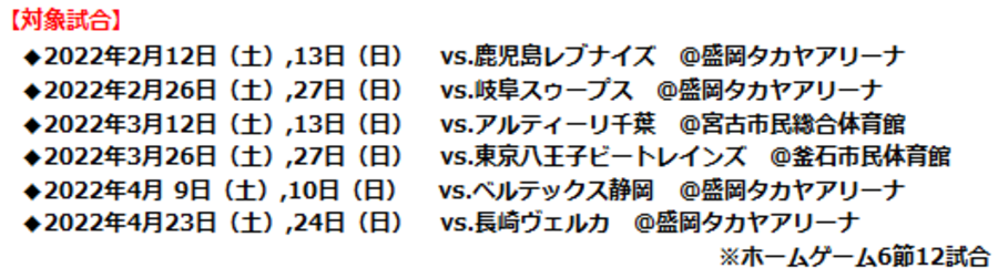 岩手ビッグブルズでは2021-22 season ホームゲームで、2月12日(土),13日(日)鹿児島レブナイズ戦から4月23日(土),24日(日)長崎ヴェルカ戦までの全6節12試合を対象としたハーフシーズンチケットを販売することになりました。