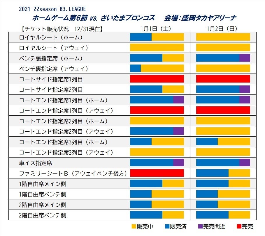 1月1日(土)、2日(日)に、盛岡タカヤアリーナにて開催いたします「竹下医院/みうら産婦人科医院 Presents B3.LEAGUE 2021-22 season 岩手ビッグブルズ vs. さいたまブロンコス」のチケット販売状況(12月22日時点)についてお知らせいたします。