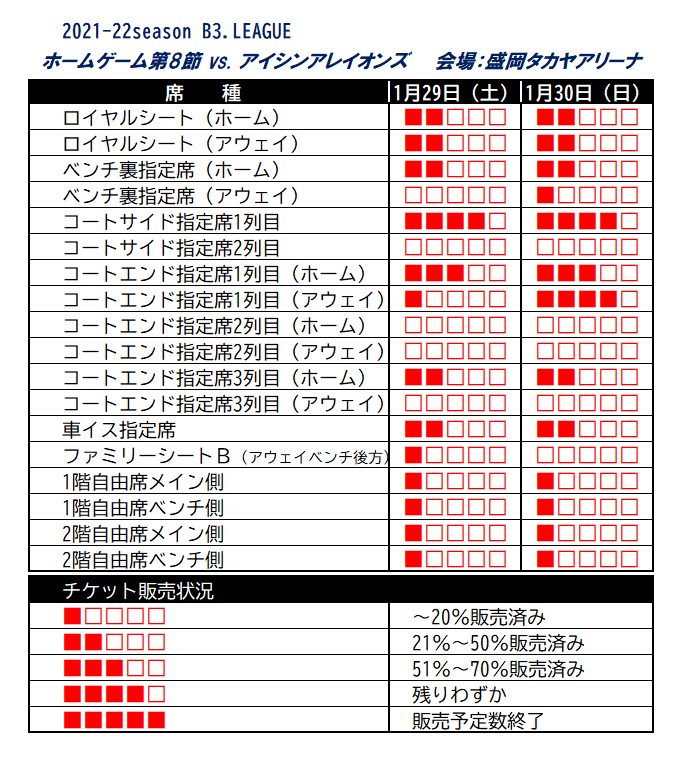 【チケット情報】アイシン戦 チケット販売状況 ※1月18日時点