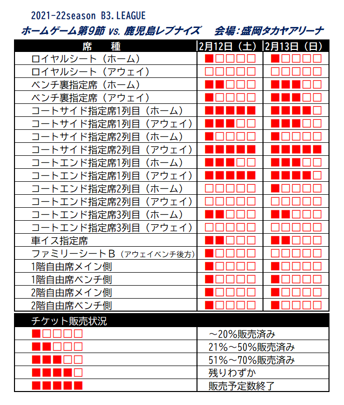 2月12日(土)、13日(日)の二日間、盛岡タカヤアリーナにて開催いたします「B3.LEAGUE 2021-22 season 岩手ビッグブルズ vs. 鹿児島レブナイズ」のチケット販売状況(2月4日時点)についてお知らせいたします。