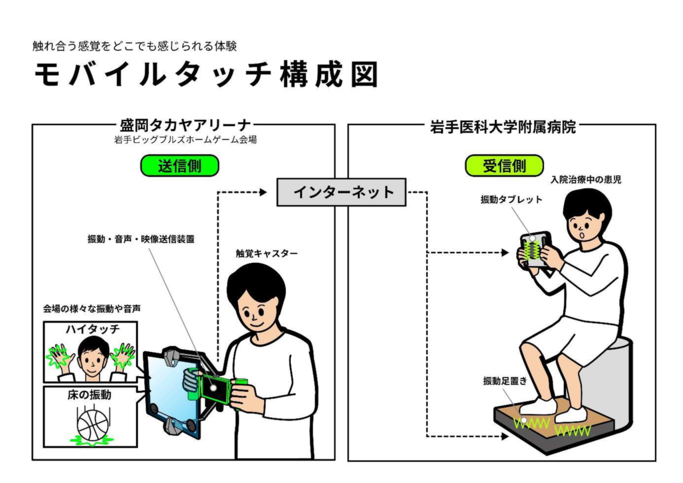 特定非営利活動法人BeingALIVEJapan様の「TEAMMATES活動」を通して岩手ビッグブルズに入団している幅下天悟くんが「触覚キャスター」として試合前の選手とコミュニケーションを行ないます。その時の映像や音声にくわえて、 幅下天悟くんの持つデバイスに選手が触れた触感が、手元や足元の振動としてリアルタイムに長期入院治療中の子供たちに伝わります。