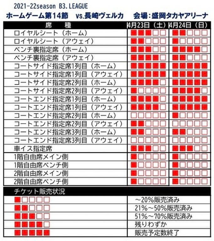 2022年4月23日(土)・24日(日)盛岡タカヤアリーナで開催される「 岩手トヨペット・ネッツトヨタ岩手・岩手トヨタ・トヨタレンタリース岩手Presents B3.LEAGUE 2021-22season ホーム最終戦 岩手ビッグブルズvs.長崎ヴェルカ」のチケット販売状況(4月15日時点)についてお知らせいたします。