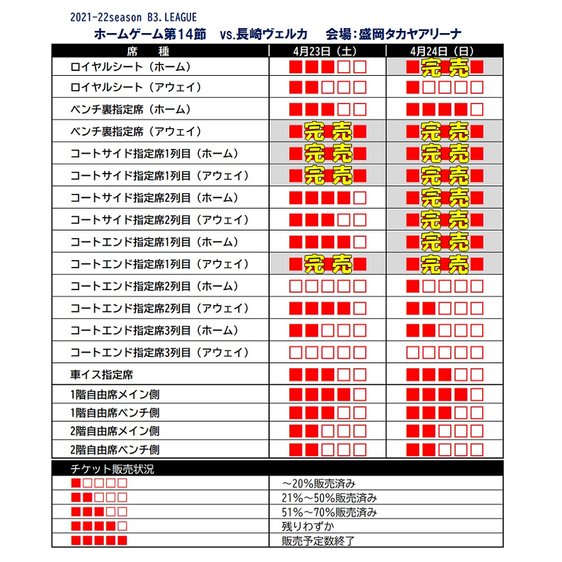 2022年4月23日(土)・24日(日)盛岡タカヤアリーナで開催される「 岩手トヨペット・ネッツトヨタ岩手・岩手トヨタ・トヨタレンタリース岩手Presents B3.LEAGUE 2021-22season ホーム最終戦 岩手ビッグブルズvs.長崎ヴェルカ」のチケット販売状況(4月21日時点)についてお知らせいたします。