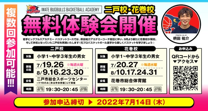 岩手ビッグブルズが運営をしている岩手ビッグブルズアカデミー バスケットコースでは、枡田祐介アカデミーコーチ就任に伴い9月より新たに花巻校を開校、そして休校となっていた二戸校を再開いたします!