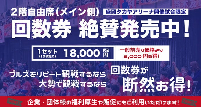 2022-23シーズンに盛岡タカヤアリーナで開催される全16試合(全席無料の開幕戦は除く)を対象とした「回数券(2階自由席メイン側)」を販売いたします!