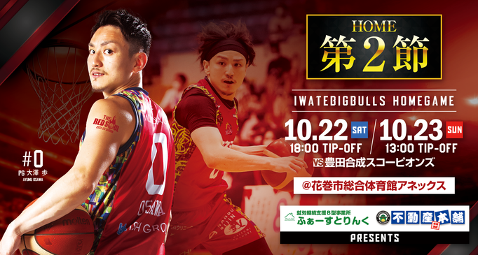 この度、岩手ビッグブルズでは、2022年10月22日(土)・23日(日)に開催される「B3.LEAGUE 2022-23season ホーム第2節 豊田合成スコーピオンズ戦」の冠パートナーが「ふぁーすとりんく」様、「不動産本舗」様に決定しました。