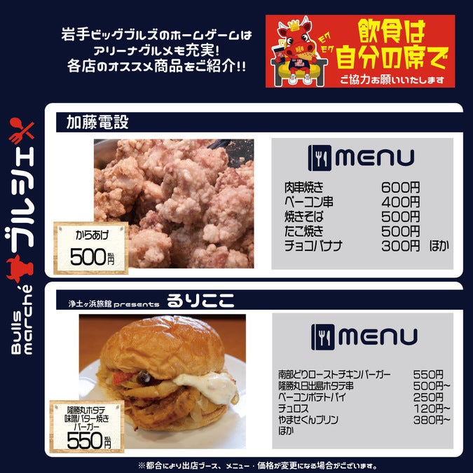 【ゲーム情報】埼玉戦 飲食ブース「Bulls marché」ラインナップご紹介