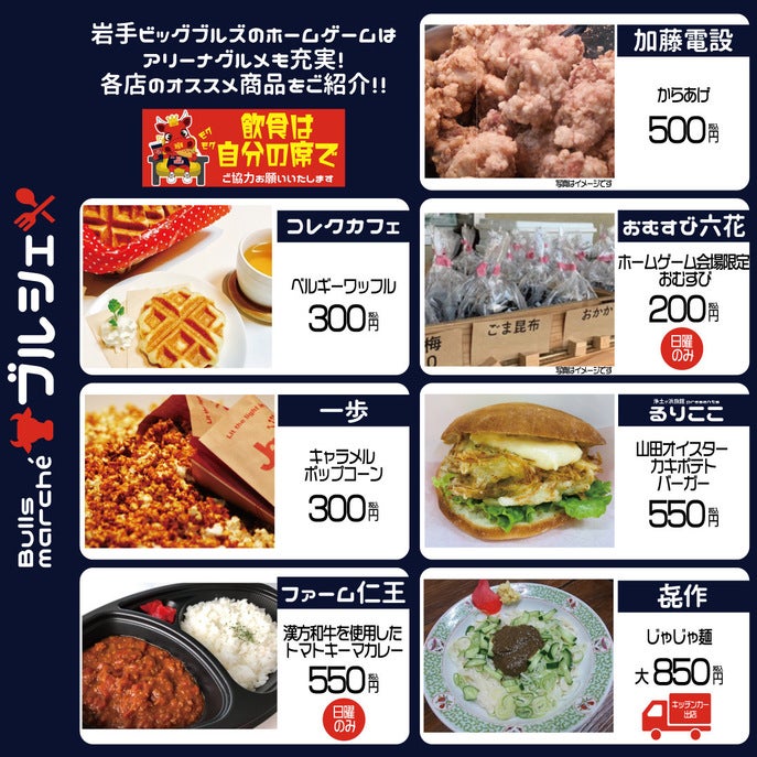 今季より飲食ブースを『Bulls marché(ブルズマルシェ)』と称し、略称『ブルシェ』としてご紹介していきます♪