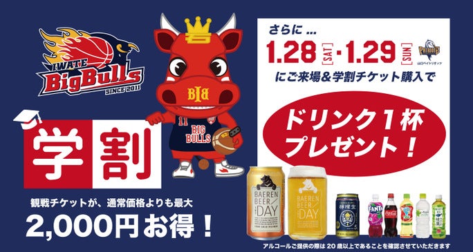 現在岩手ビッグブルズでは、岩手ビッグブルズのホームゲームを学生の皆様にも気軽に試合観戦を楽しんでいただきたいと思い、お得な”学割”価格でチケットを販売しております♪