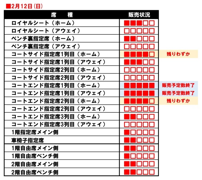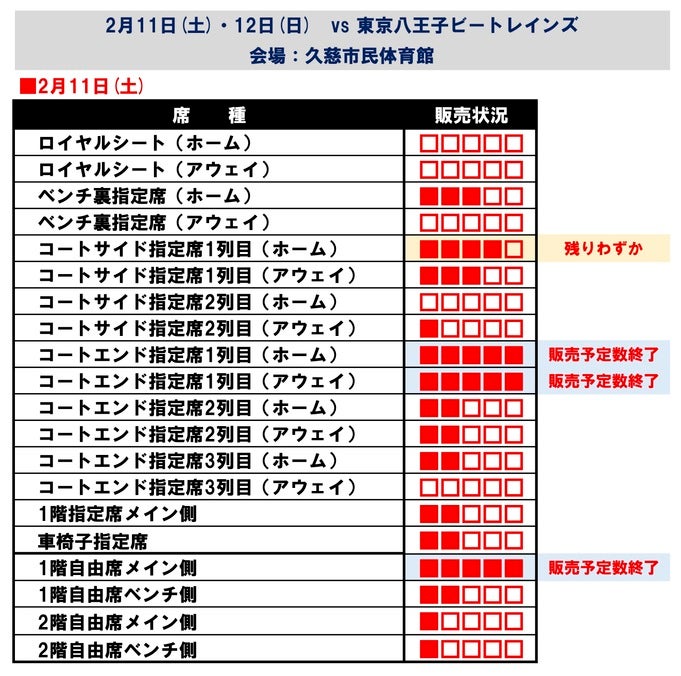 【チケット情報】八王子戦 チケット販売状況 ※2月7日時点