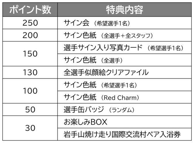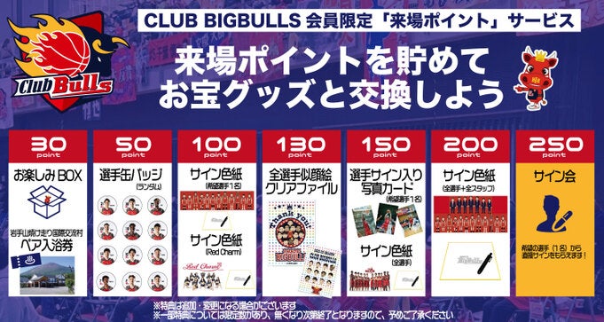 CLUB BIGBULLS会員様がホームゲームにご来場いただいた際に付与させていただく「来場ポイント」を、特典と交換させていただくサービスです。