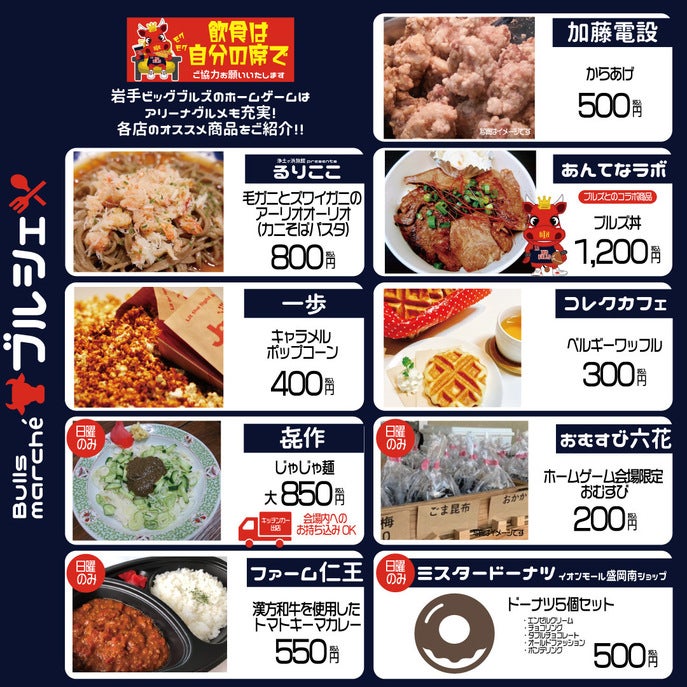 【ゲーム情報】立川戦 飲食ブース「Bulls marché」ラインナップご紹介