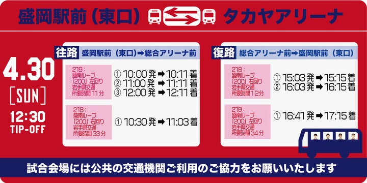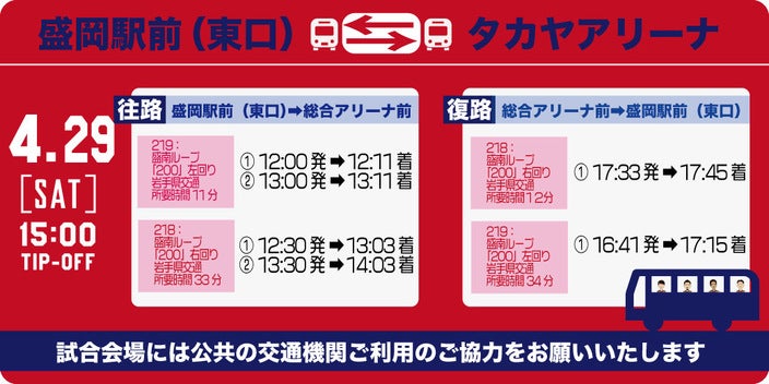 2023年4月29日(土)・30日(日)・5月1日(月)に盛岡タカヤアリーナで開催される「岩手トヨペット・ネッツトヨタ岩手・岩手トヨタ・トヨタレンタリース岩手/カネマンPresents B3 PLAYOFFS SEMIFINALS 2022-23 岩手ビッグブルズvs.横浜エクセレンス」の駐車場・公共交通機関についてご案内いたします。