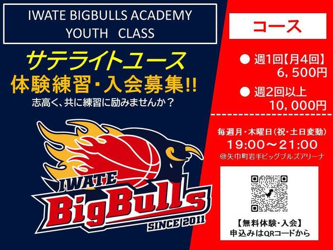 2023年度より岩手ビッグブルズユースチームでは、中学校の部活動に所属しながら掛け持ちでスキルアップを目指す『サテライトユース生』の随時体験・入会募集を行っております。
