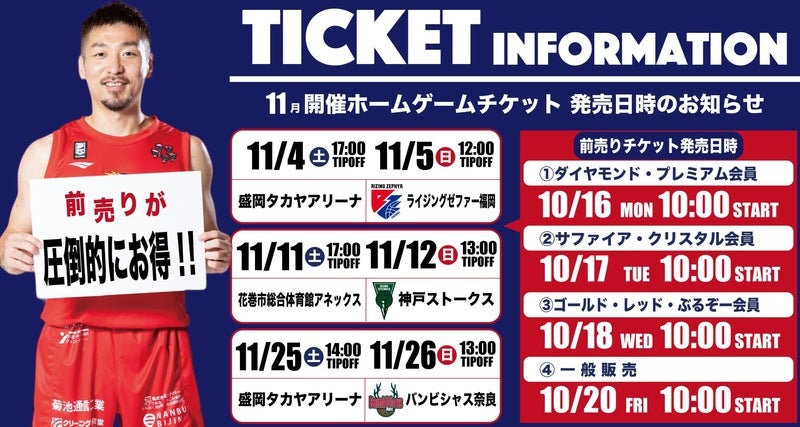 11月開催ホームゲーム観戦チケットの販売スケジュールが決定いたしましたのでお知らせいたします。