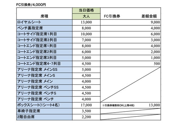 ・アップグレード対象チケット・引換券に対し、そのチケット相当額を変更希望席種の当日価格より差し引き、差額をお支払いいただきます。