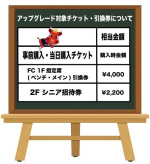 アップグレードとは……試合当日にお手持ちのチケットから、ご希望のお席の当日券価格との差額を支払うことにより、ご希望の席種のチケットに交換できるサービスです。また当日ご購入のチケットからアップグレードすることも可能です。
