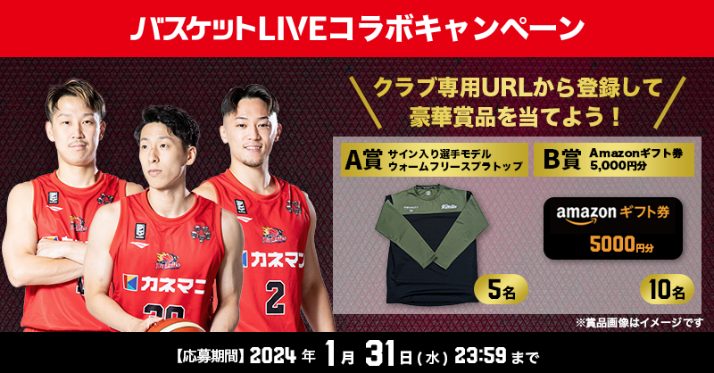 下記リンクからバスケットLIVEのご利用登録&視聴を行っていただき、応募フォームからエントリーしていただくと、抽選で豪華賞品が当たるキャンペーンを実施いたします。クラブ専用URLから登録を行っていただくことでクラブへの支援にも繋がりますので、ぜひご登録をお願いいたします。