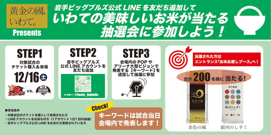 2023年12月16日(土)に盛岡タカヤアリーナで開催される「2023-24SEASON B2リーグ戦 黄金の國、いわて。Presents 岩手ビッグブルズvs.山形ワイヴァンズ」でいわての美味しいお米が当たるLINE抽選会を開催します!