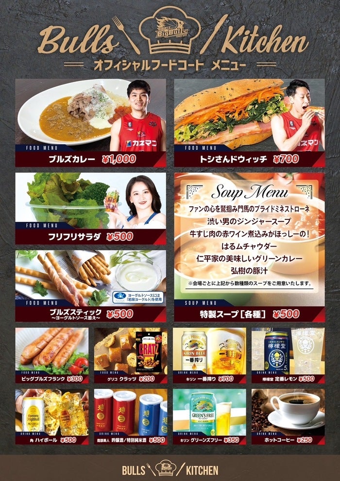 今季よりアリーナ内の飲食ブースを岩手ビッグブルズフードコーディネーターが担当することになりました!『Bulls Kitchen(ブルズキッチン)』と称し、選手やチームスタッフ、Red Charmにちなんだメニューをご提供します♪