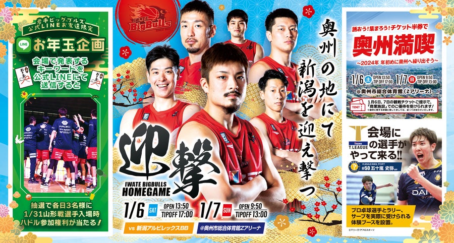 2024年1月6日(土)・7日(日)に奥州市総合体育館(Zアリーナ)で「2023-24SEASON B2リーグ戦 髙惣建設/白金運輸Presents 岩手ビッグブルズvs.新潟アルビレックスBB」の試合情報をお知らせ致します。