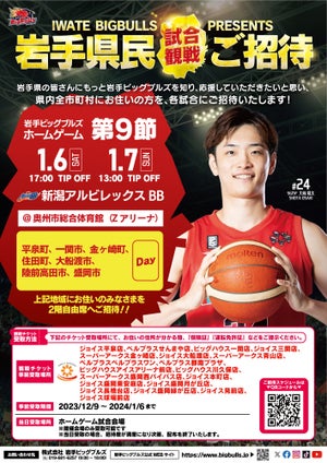 岩手ビッグブルズの1/6(土)・7日(日)の観戦チケットまたは半券の提示で、