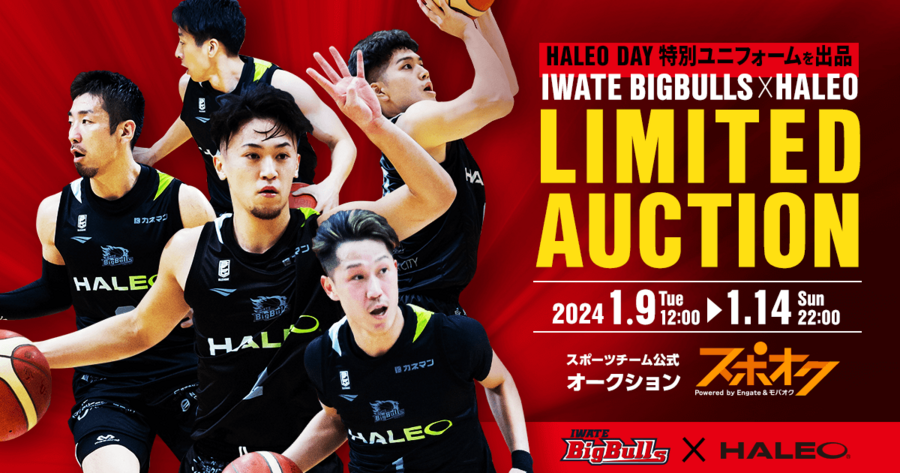 岩手ビッグブルズでは、2023年11月4日(土)の試合において冠スポンサーを務めていただいた株式会社ボディプラスインターナショナル様とのコラボレーション企画「HALEO DAY特別ユニフォーム」に各選手の直筆サインを入れて出品する『IWATE BIGBULLS × HALEO LIMITED オークション』の実施が決定しましたので、お知らせいたします。
