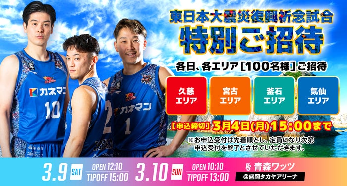 岩手ビッグブルズは、東日本大震災で被害の大きかった岩手の沿岸地域【久慈エリア、宮古エリア、釜石エリア、気仙エリア】にお住まいの皆さまを、東日本大震災復興祈念試合となる3月9日(土)・10日(日)にご招待いたします。