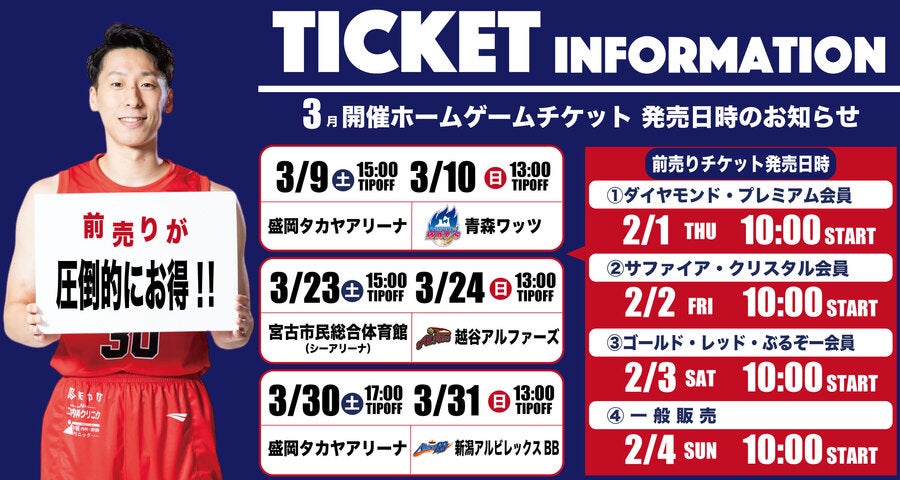 3月開催ホームゲーム観戦チケットの販売スケジュールが決定いたしましたのでお知らせいたします。