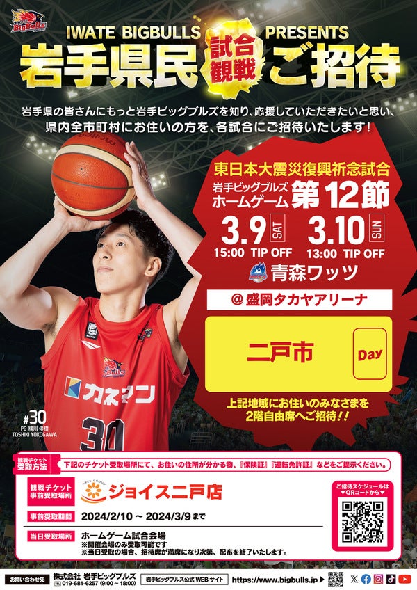 2024年3月9日(土)・10日(日)に盛岡タカヤアリーナで開催する「2023-24SEASON B2リーグ戦 イワテ美容商事/岩手日報社presents 東日本大震災復興祈念試合 岩手ビッグブルズvs.青森ワッツ」の試合情報をお知らせ致します。