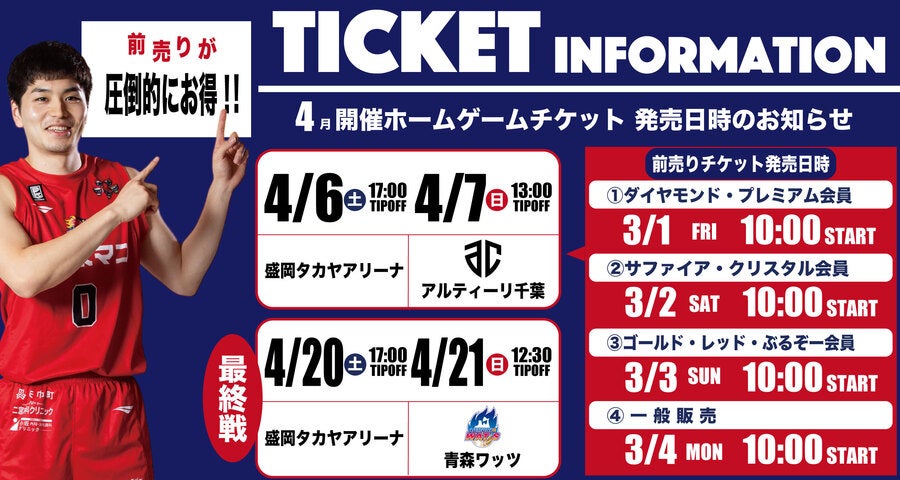 4月開催ホームゲーム観戦チケットの販売スケジュールが決定いたしましたのでお知らせいたします。