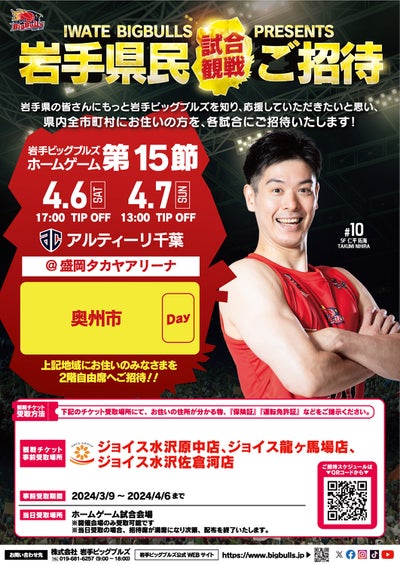 このたび岩手ビッグブルズでは、2024年4月6日(土)・7日(日)に開催される「2023-24SEASON B2リーグ戦 ホーム第15節」の冠パートナーが 「トヨタL&F岩手」様に決定しました。