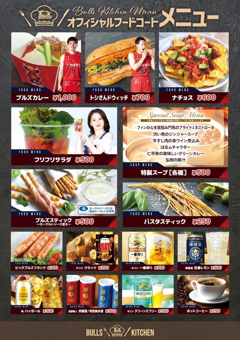 岩手ビッグブルズフードコーディネーターが担当する『Bulls Kitchen(ブルズキッチン)』選手やチームスタッフ、Red Charmにちなんだメニューをご提供します♪