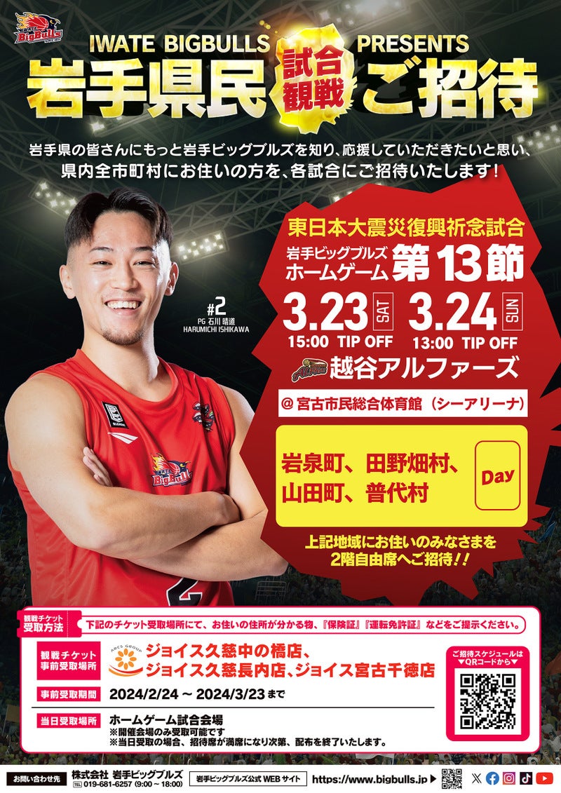 2024年3月23日(土)・24日(日)に宮古市民総合体育館(シーアリーナ)で開催される「2023-24SEASON B2リーグ戦 岩泉ホールディングス Presents 東日本大震災復興祈念試合 Supported by 宮古市 岩手ビッグブルズvs.越谷アルファーズ」の試合情報をお知らせ致します。