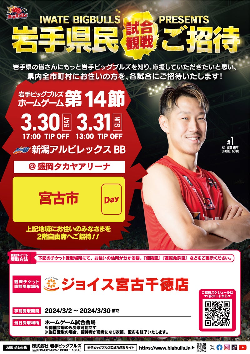 2024年3月30日(土)・31日(日)に盛岡タカヤアリーナで開催される「2023-24SEASON B2リーグ戦 岩手日産・日産プリンス岩手 Presents 岩手ビッグブルズvs.新潟アルビレックスBB」の試合情報をお知らせいたします。