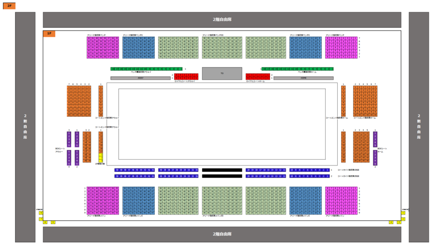 ※上記は盛岡タカヤリーナの会場レイアウトとなりますがコート周りの配置は同一となります。