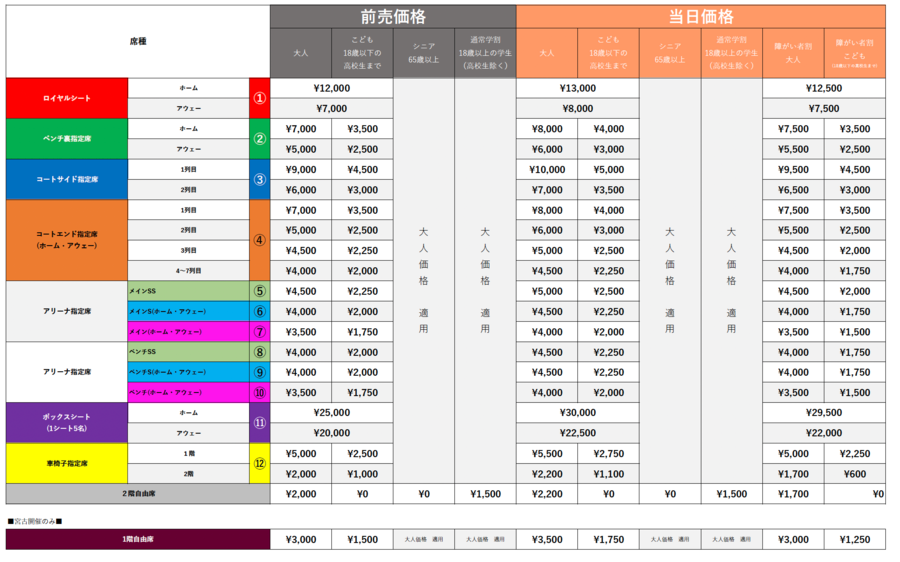全席種 通常、試合毎の前売り価格チケット・当日価格チケット