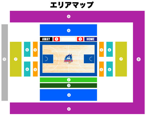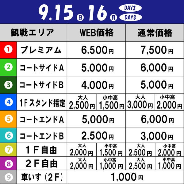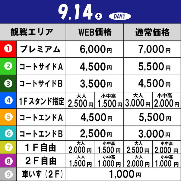 例:9/14 GAME1のコートサイドAを購入→9/14 GAME2は2F自由で観戦可能