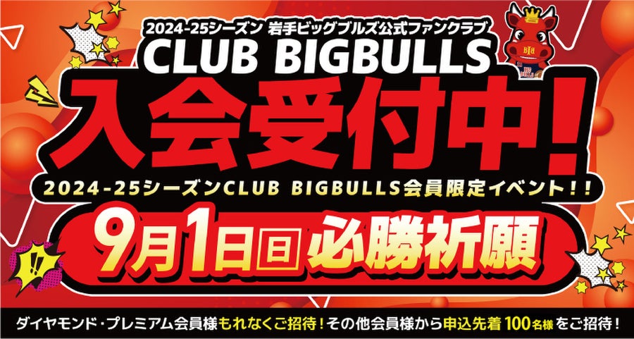 岩手ビッグブルズでは、2024年9月1日(日)に盛岡八幡宮で実施する「2024-25season必勝祈願」に、2024-25season CLUB BIGBULLSダイヤモンド会員・プレミアム会員様をご招待、クリスタル・レッド・ぶるぞー・シルバー会員様も先着申込100名様(予定数より増枠)をご招待させていただくことが決まりましたのでお知らせいたします。
