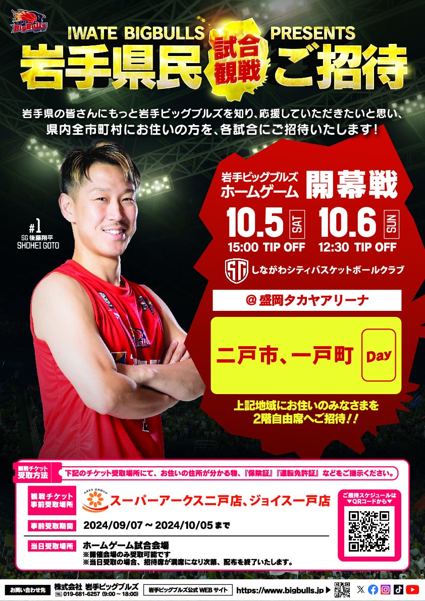 より多くの岩手県民の皆様にチームの魅力を知っていただくため3シーズン前からスタートした「33市町村招待プロジェクト」。開幕戦は、二戸市・一戸町にお住まいの方をご招待いたします!